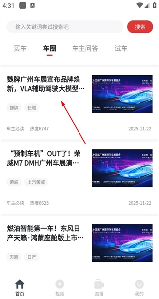 4、登录操作完成后,返回首页界面,切换到车圈标签页,浏览该分类下的汽车相关资讯内容。