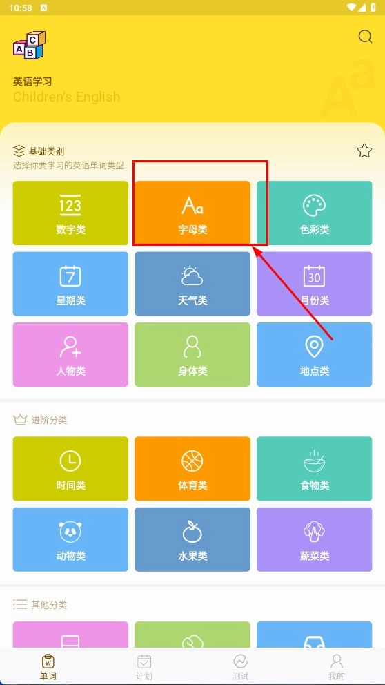 1、在英语学习页面,点击【字母类-单词类型按钮】,进入字母学习界面。