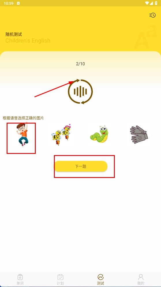 4、点击底部【测试-功能按钮】,进入随机测试页面,根据语音选择正确图片后点击【下一题-功能按钮】继续测试。