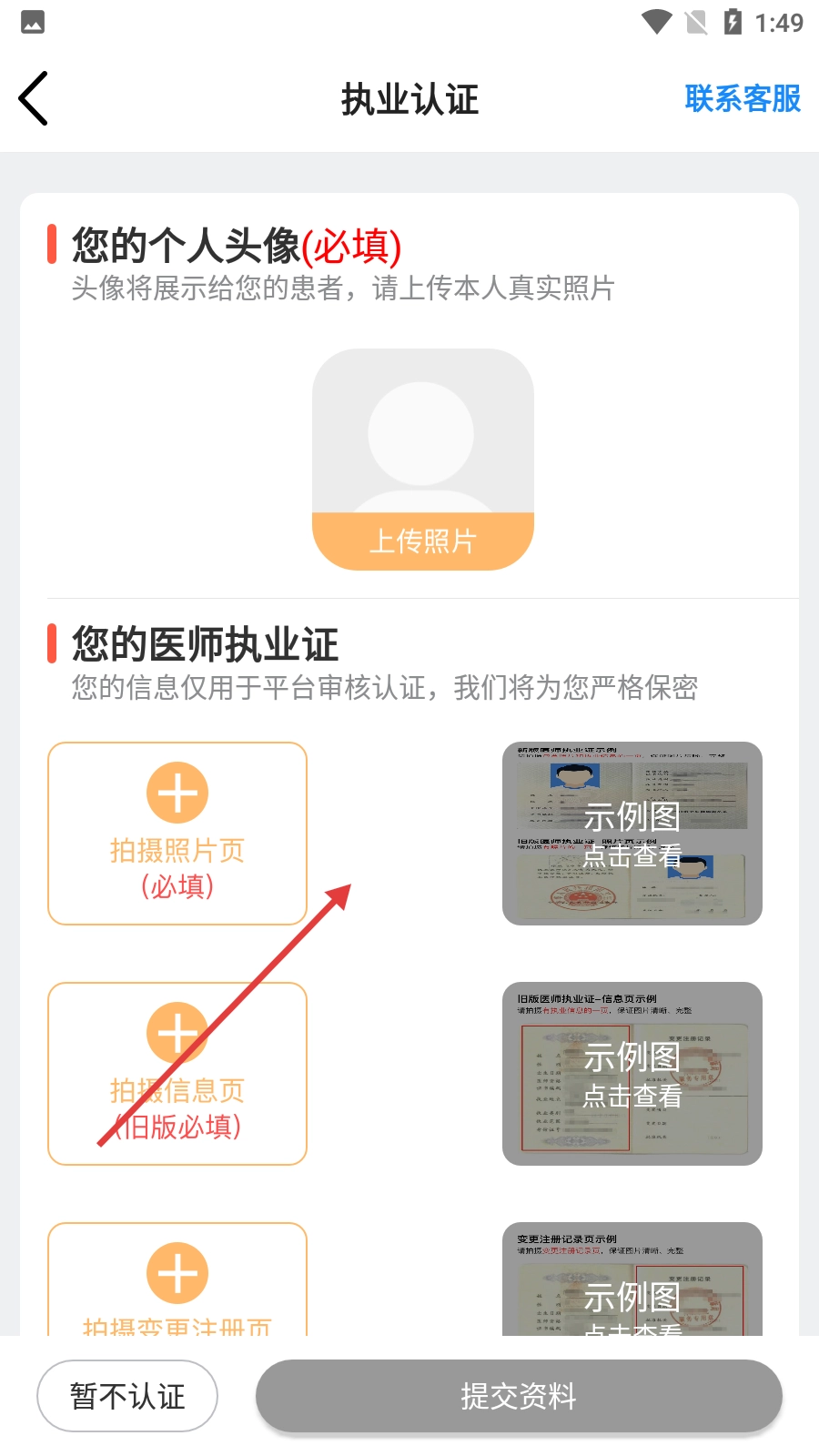4、登录系统后进入执业认证界面,需上传个人头像照片与医师执业证照片,资料上传完毕即可提交进行认证。