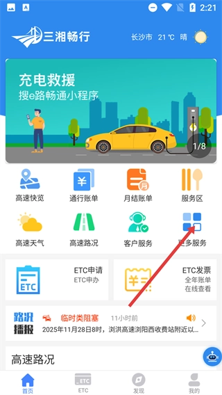 1、打开“三湘畅行”的首页后,找到并点击【更多服务】这个选项,就能进入到整合了各类功能的服务页面。