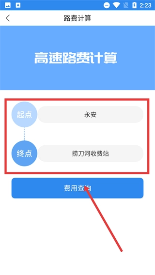 3、进入路费计算页面,填写好起点和终点的相关信息后,点击【费用查询】按钮,即可获取该路段对应的高速路费数据。