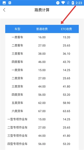 4、进入查询结果页面后,查看各车型对应的普通收费与ETC收费标准,从中获取所需的路费相关信息。