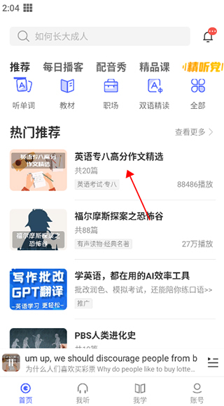 我们提供听众自主上传音频资源的功能,并会为您制作能随音频播放同步高亮显示的字幕。