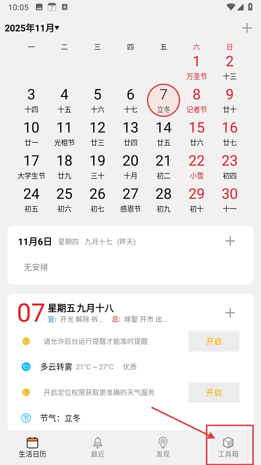 1、在生活日历软件中,点击右下角【工具箱】按钮,可进入工具箱界面。