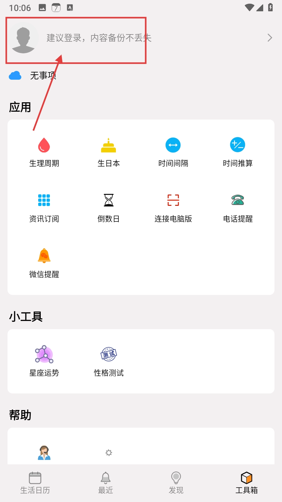2、进入工具箱界面后,点击【建议登录,内容备份不丢失】区域,可进入用户登录界面。