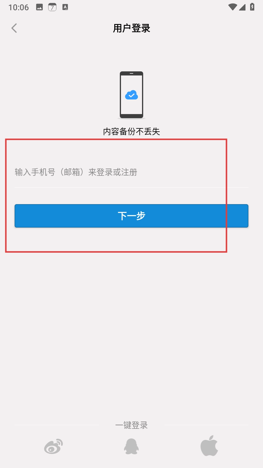 3、在用户登录界面,输入手机号(邮箱)后点击【下一步】,可进行登录或注册流程。