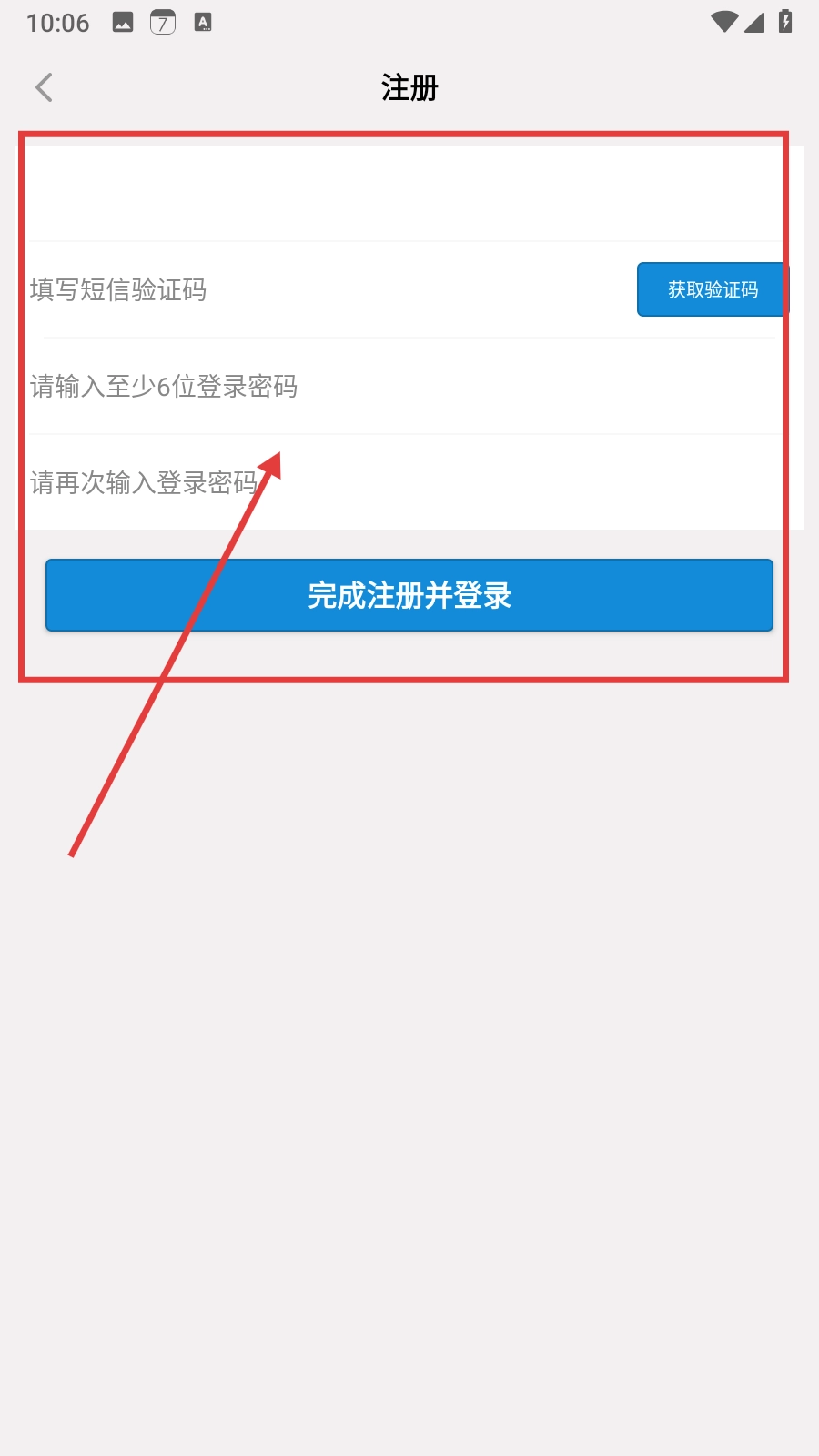 4、在注册界面,填写短信验证码、输入至少6位的登录密码并再次确认密码后,点击【完成注册并登录】即可完成注册并登录账号。