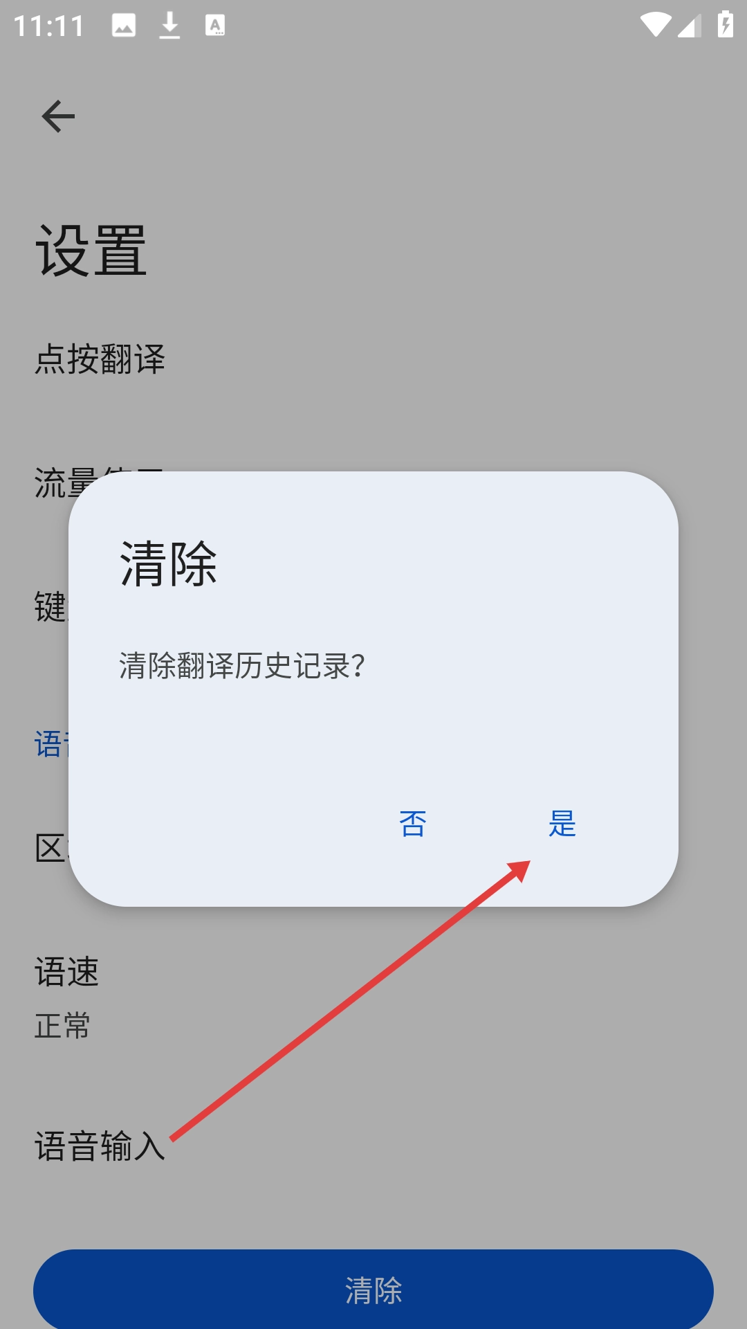 4、在清除确认框中点击【是】,清除翻译历史记录。