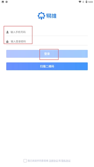 1、在“易维”登录界面,输入手机号码与登录密码,勾选协议后点击【登录】,进入系统。