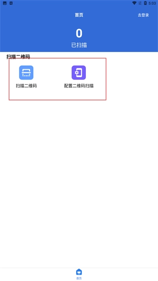 2、登录后进入首页,选择【扫描二维码】功能,可启动扫码操作;选【配置二维码扫描】可设置扫码参数。