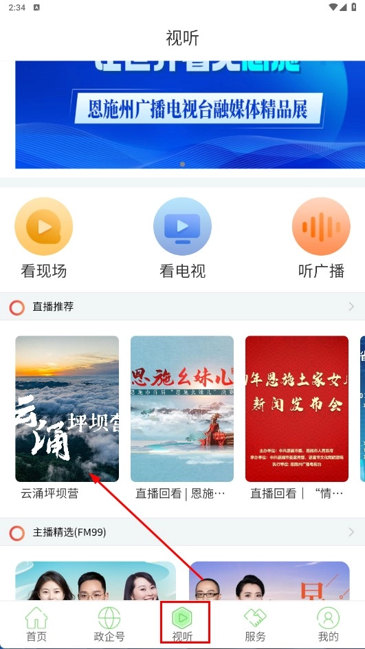 3、点击【视听】,可看现场-看电视-听广播,选择直播推荐的【云涌坪坝营】视频观看。