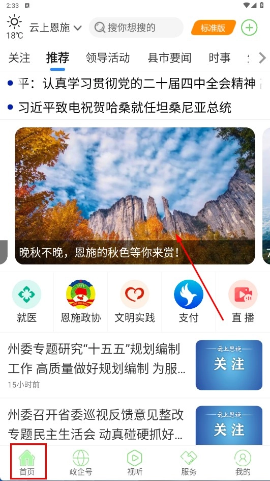 1、在【首页】,可浏览恩施新闻,使用【就医】-【支付】等服务,查看恩施秋色推荐。