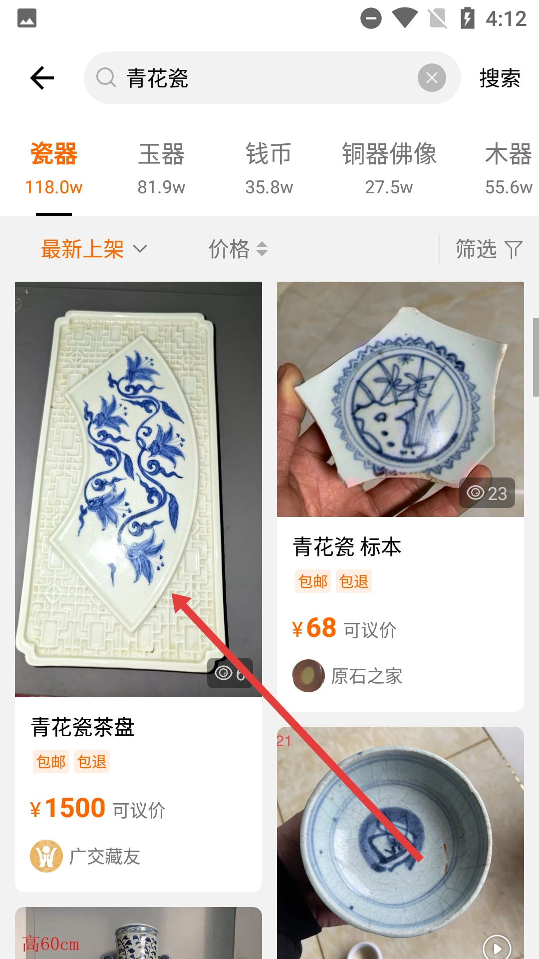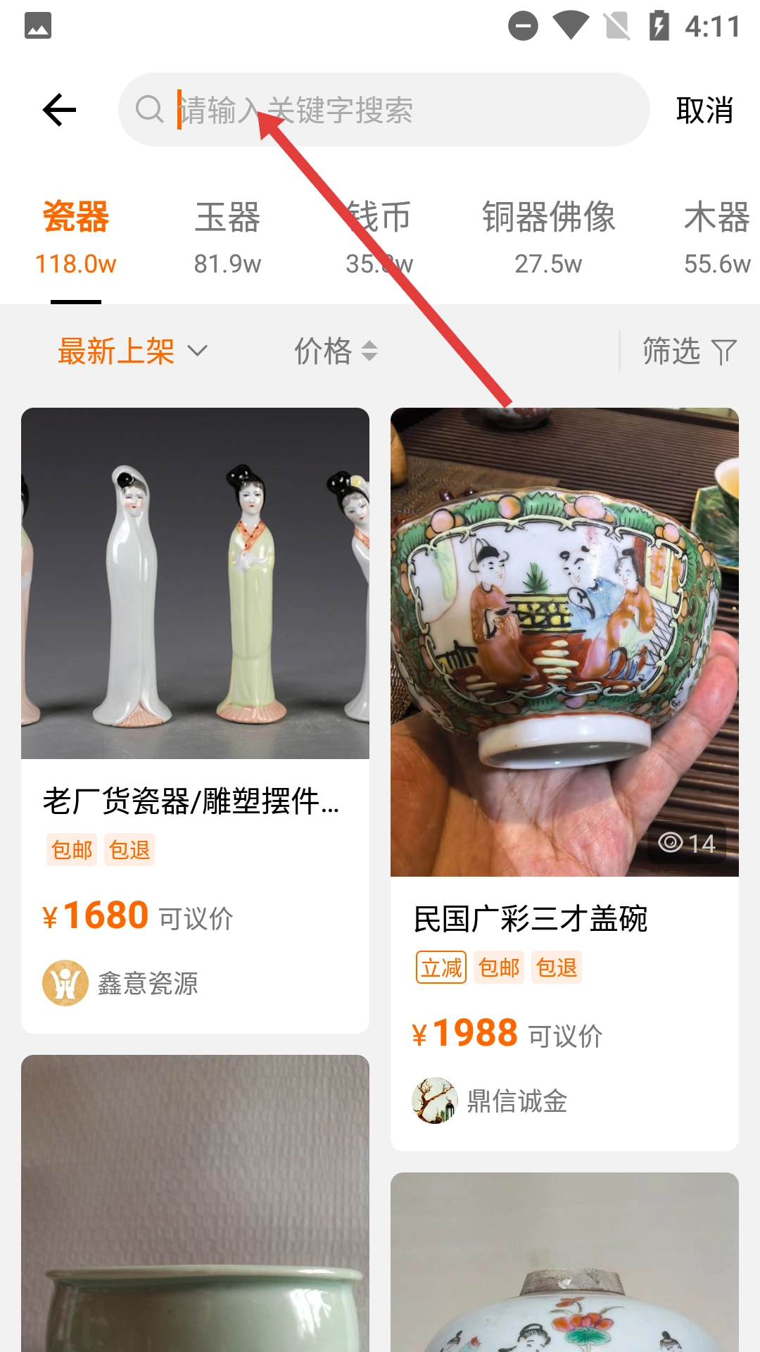2、在地摊板块页面的搜索栏,输入关键词,如【瓷器】相关内容,进行搜索。