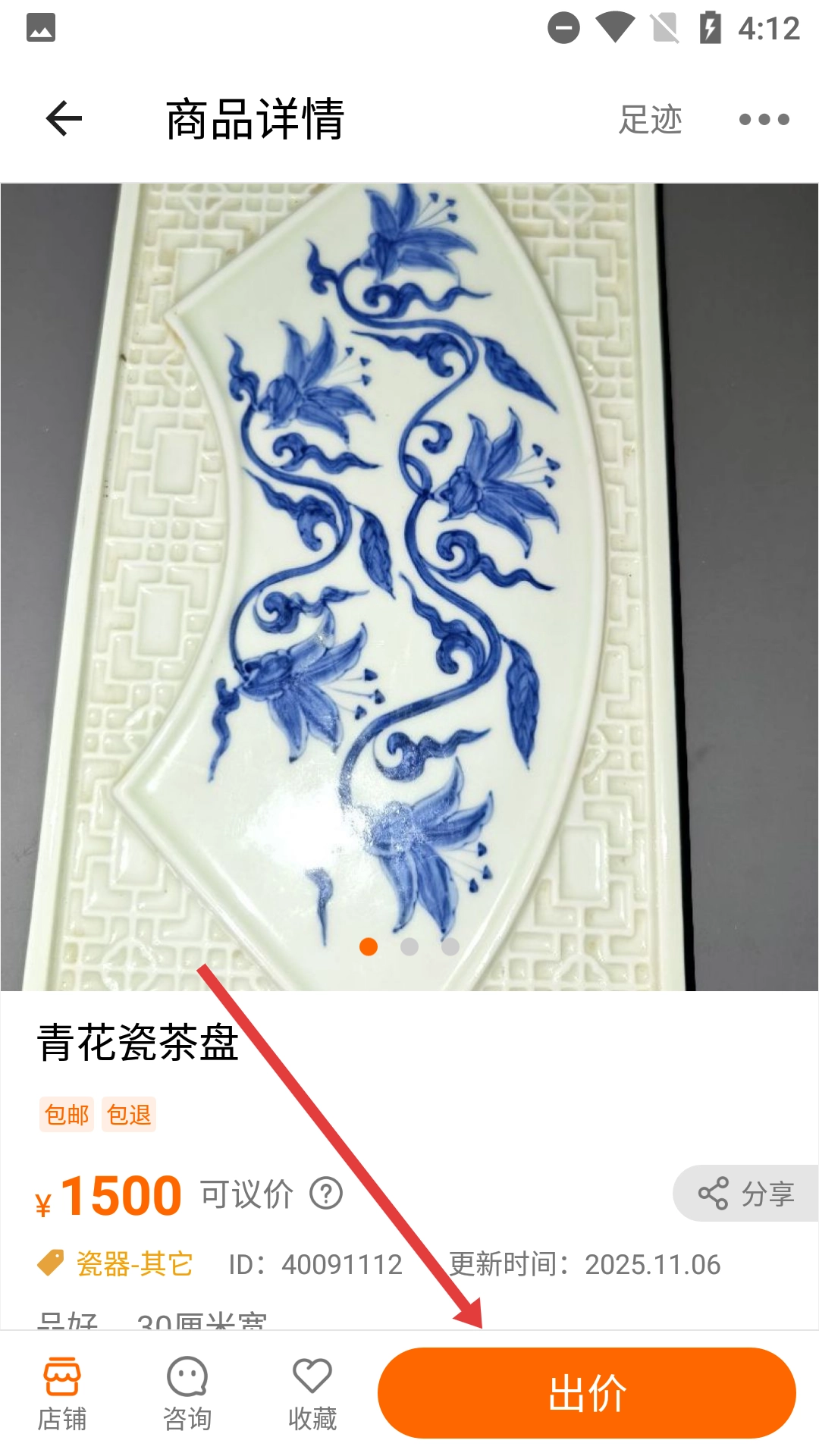 4、进入商品详情页后,点击【出价】按钮,可参与该青花瓷茶盘的竞价交易。