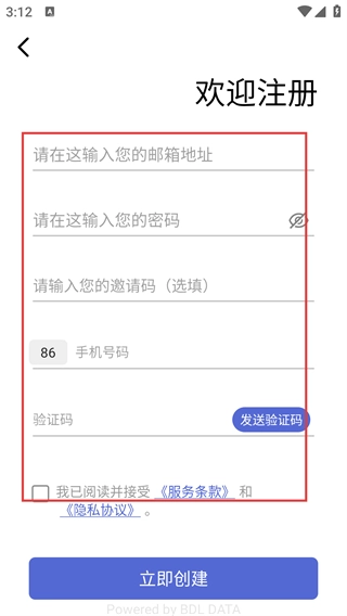 3、在【欢迎注册】页面,填写邮箱-密码-手机号码等信息,获取并填验证码,勾选协议后点击【立即创建】完成注册。