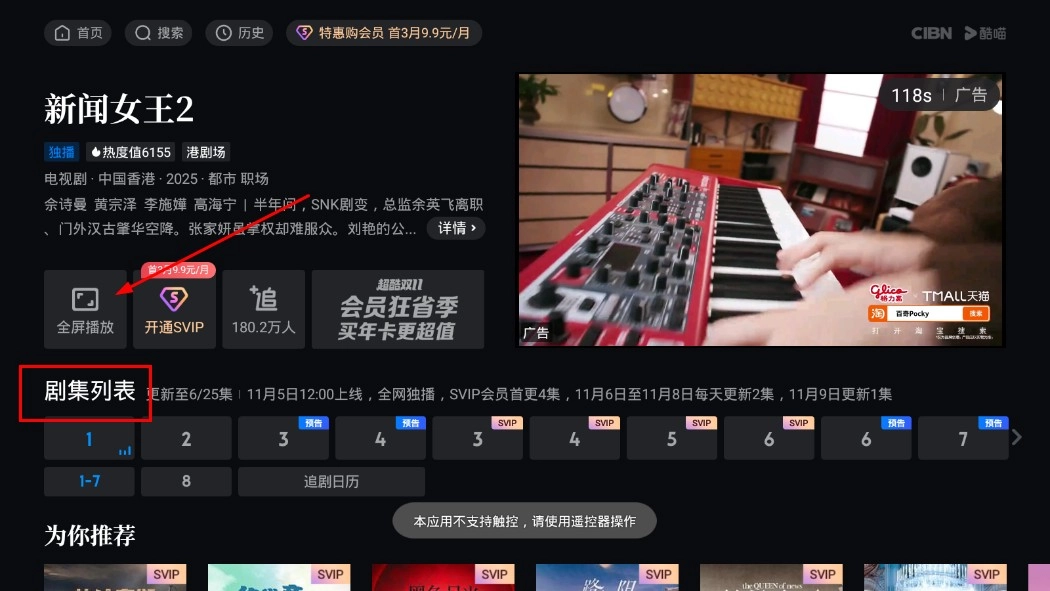 3、在《新闻女王2》剧集页面,可点击【全屏播放-功能按钮】观看剧集,也可在【剧集列表-板块】选择具体集数观看。
