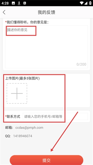 2、在反馈页面的输入框中填写【描述你的意见】,填写【联系方式】后,点击【提交】按钮,将反馈内容提交至平台,完成意见反馈流程。