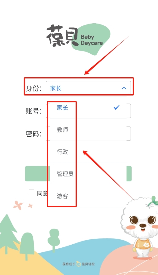2之后进入身份选择页面,按照自身实际角色,从家长、教师、行政人员、管理员以及游客这几个选项中挑选对应的身份。