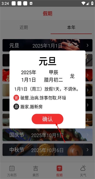 2、在元旦之后选择弹出详情弹窗,展示2025年1月1日当天的干支、生肖、放假安排以及宜忌相关事项,用户查看完信息后,点击确认按钮即可关闭该弹窗。