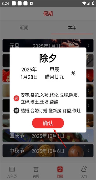 3、选择除夕时弹出详情弹窗,展示2025年1月28日的干支生肖及其对应的宜忌事项,查看完这些信息后点击确认按钮即可关闭弹窗。