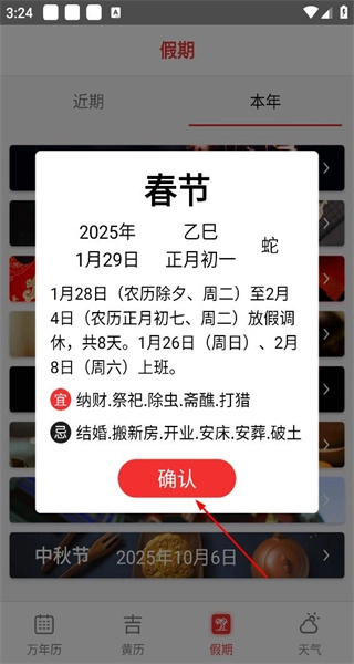 4、选择春节弹出的详情弹窗,会展示2025年1月29日对应的干支生肖、放假调休安排以及宜忌事项,查看完毕后点击确认按钮即可关闭弹窗。