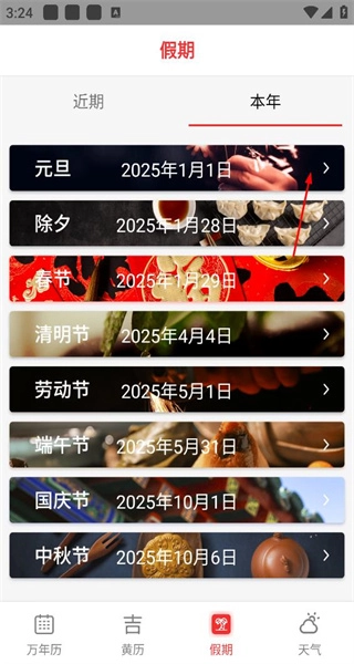 1、启动软件后,进入假期板块,在本年分类下会展示元旦、除夕、春节等节日及其对应的日期,点击元旦选项即可查看它的详细信息。