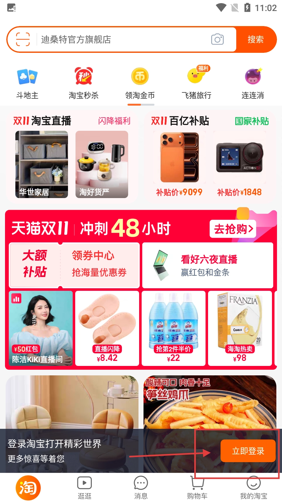 1、打开淘宝应用,在首页界面找到右下角的【立即登录】按钮并点击,随后进入登录页面。
