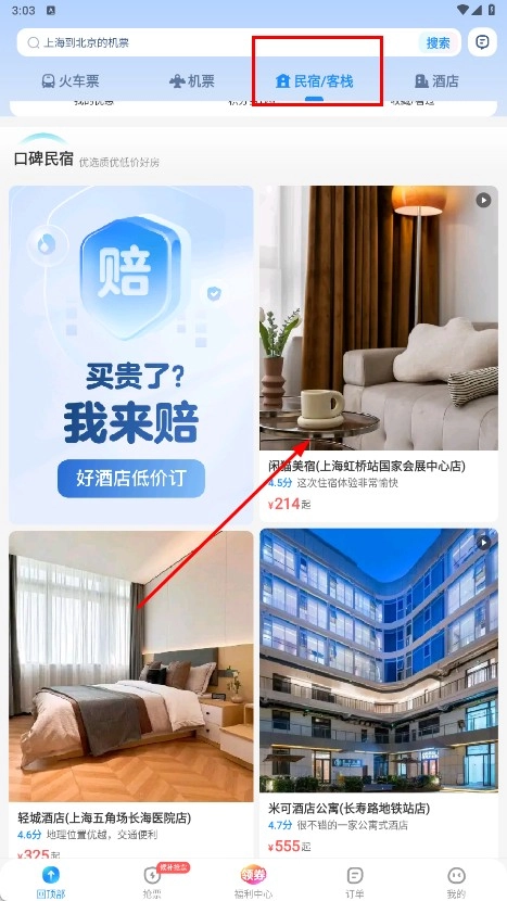 4、点击【民宿/客栈】功能入口,进入民宿查询页面后,就能浏览并挑选自己喜欢的民宿(例如闲栖美宿)。