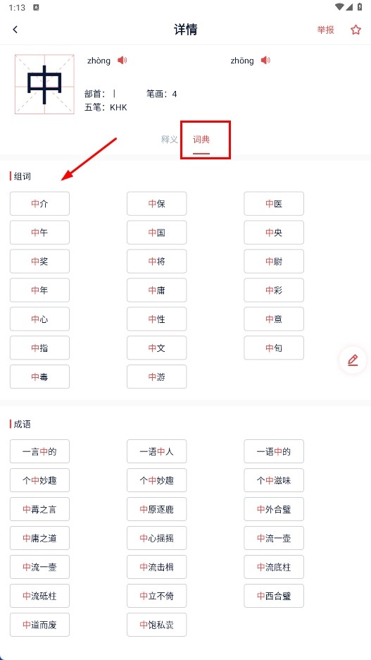 4、点击【词典-功能标签】,就能查看该汉字对应的【组词】以及成语等相关内容。