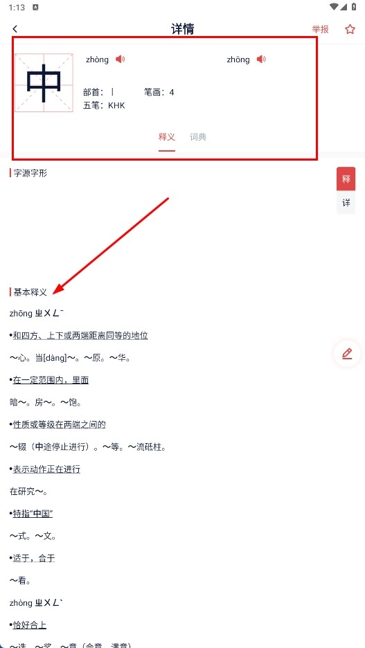 在详情页面中,能够查看该汉字的部首、笔画、五笔信息,以及【基本释义-内容板块】的相关内容。