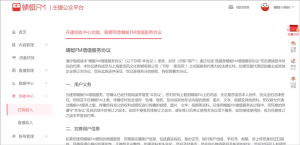 1首先进入蜻蜓主播平台的后台创收板块,然后仔细阅读平台提供的“蜻蜓FM增值服务相关协议条款”。