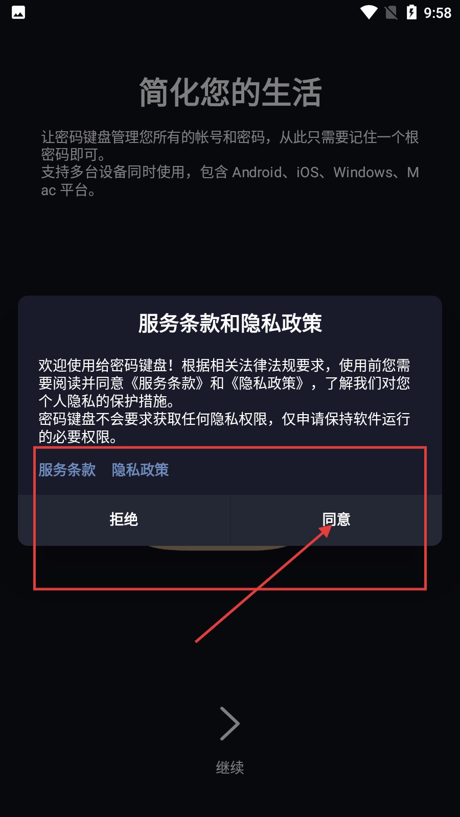 1、使用密码键盘软件前,需点击【同意】以确认接受【服务条款】和【隐私政策】,方可继续使用软件服务。