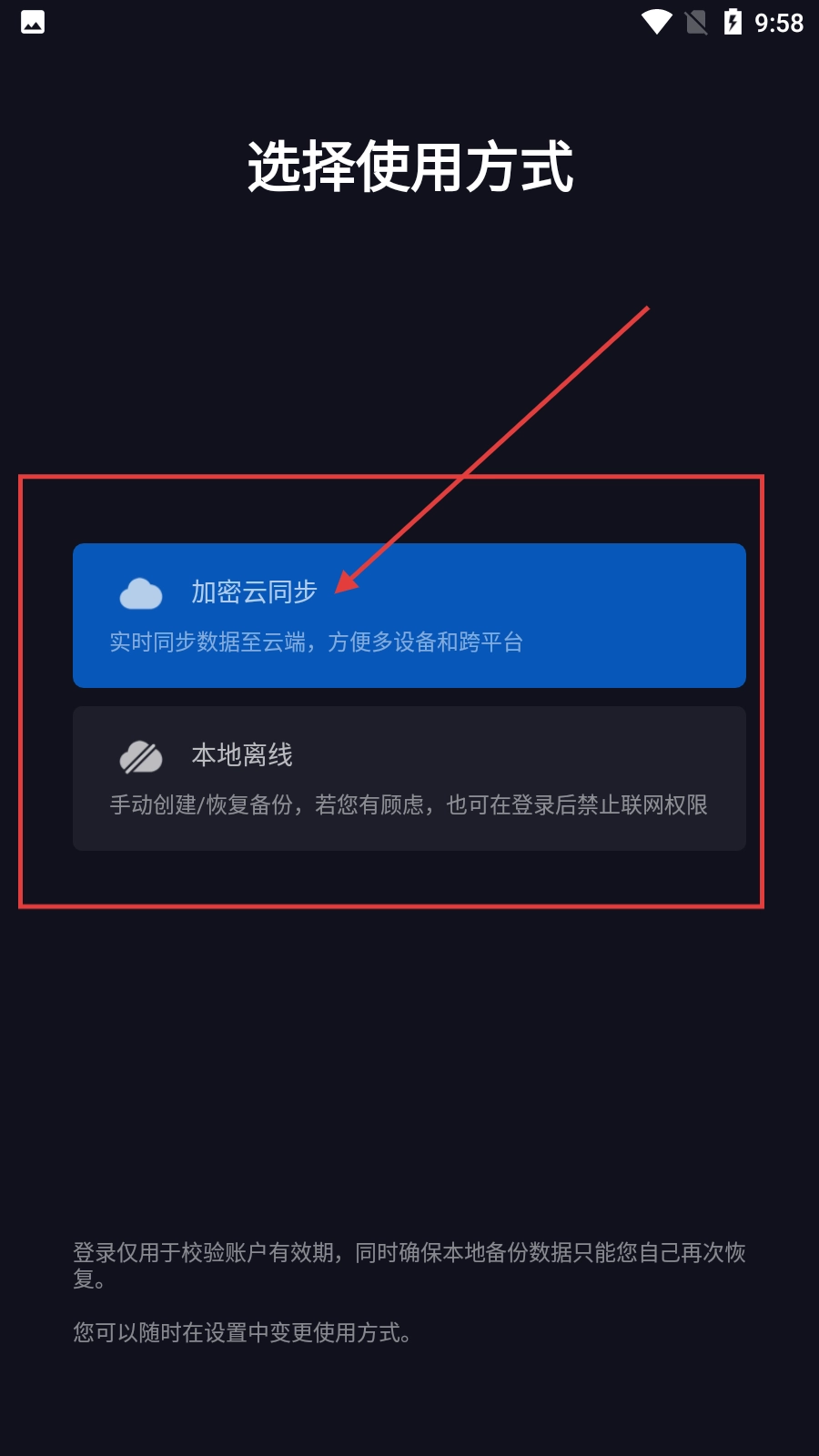 2、进入选择使用方式界面后,可选择【加密云同步】方式,该方式可实时同步数据至云端,方便多设备和跨平台使用。