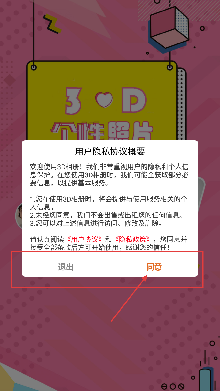 1、使用3D相册前,需阅读《用户协议》和《隐私政策》,点击【同意】方可开始使用。