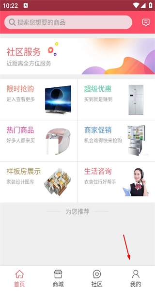 2、进入主界面后,浏览社区服务、限时抢购等板块内容,接着点击底部的“我的”按钮,进入对应的登录页面。