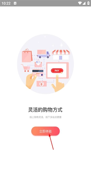 打开软件后,会看到介绍灵活购物方式的引导页面,点击“立即体验”按钮即可进入软件主界面。