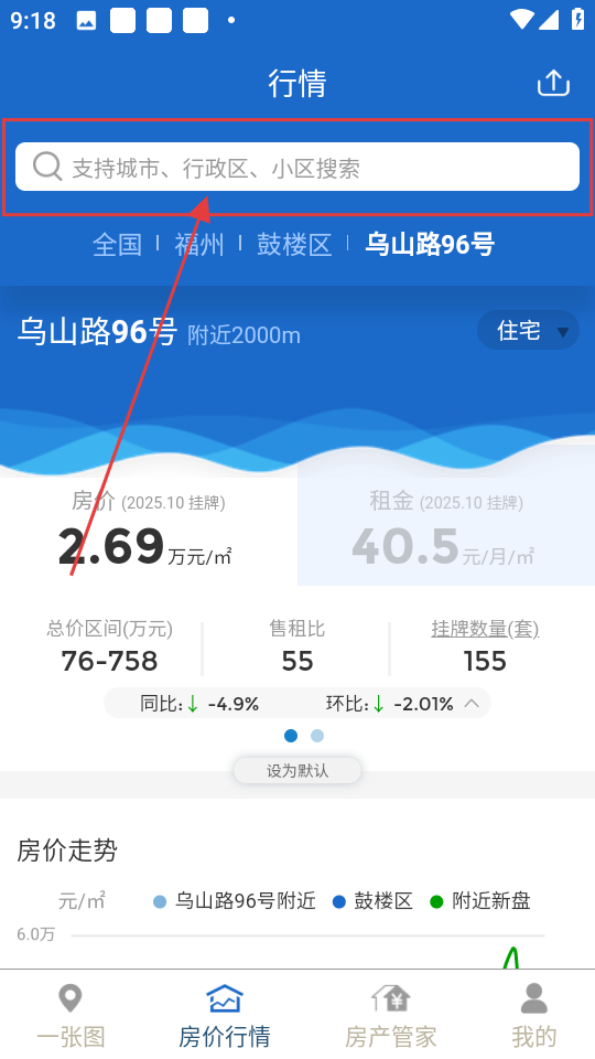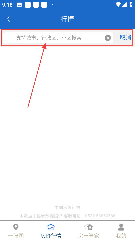 1、在房价行情页面,点击顶部的搜索框,就能进入搜索页面,为输入想要查询的城市做准备啦。