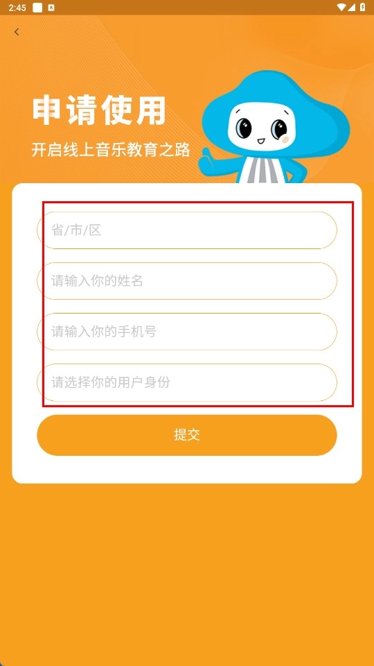 3、在申请使用页面,填写省/市/区、姓名、手机号、用户身份后点击【提交-功能按钮】。
