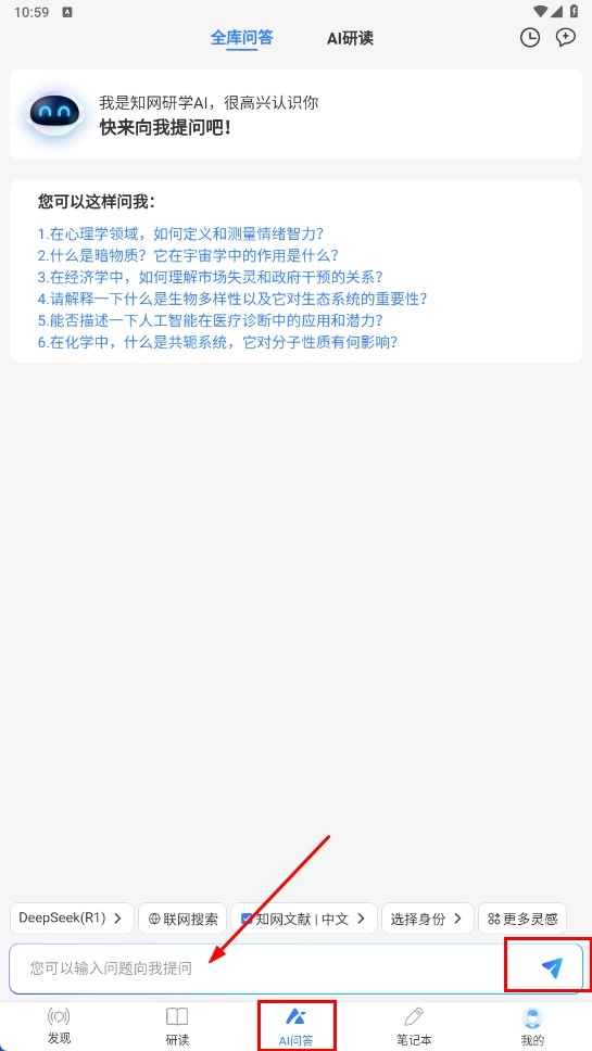 4、点击底部的【人工智能问答】功能按钮,进入对应的问答页面,在输入框中输入你想询问的问题,然后点击发送按钮,就能向人工智能发起提问了。