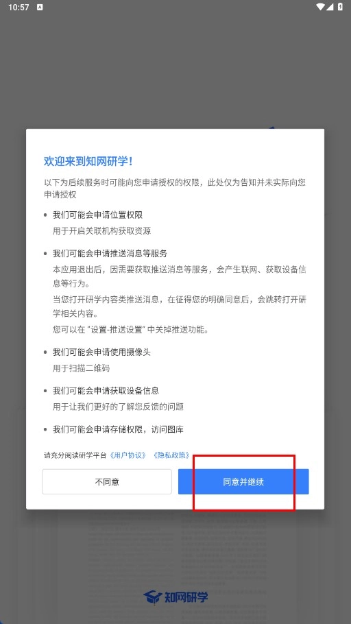 1、仔细阅读《知网研学-权限告知》内容后,点击“同意并继续”功能按钮。
