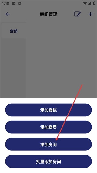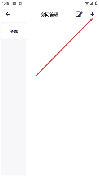 2、进入房间管理页面后,点击右上角的“+”按钮,页面会弹出房间信息的添加选项菜单。