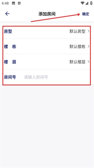 4、进入添加房间页面后,需按顺序选择对应的房型、楼栋与楼层,接着填写房间号,所有信息填写完毕后,点击【确定】按钮即可完成房间信息的保存。