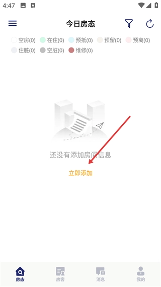 1、当处于“今日房态”页面时,若页面显示“还没有添加房间信息”,请点击【立即添加】按钮,即可进入房间管理的操作界面。