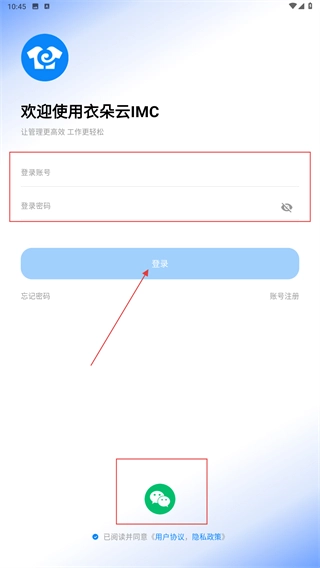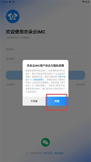 2、阅读《衣朵云IMC用户协议与隐私政策》后,点击【同意】按钮,确认协议以继续使用服务。