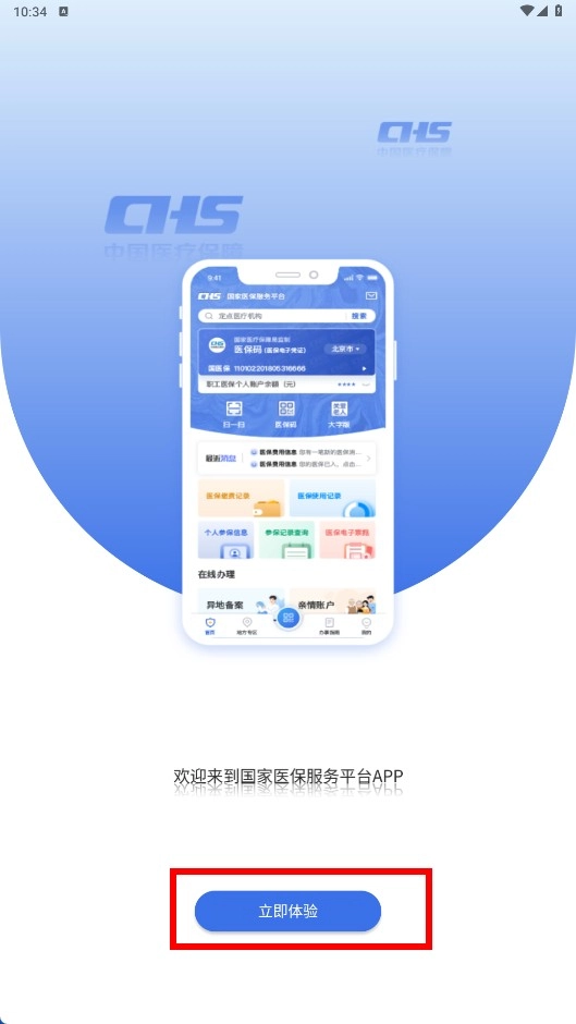 1、点击【立即体验-功能按钮】,进入国家医保服务平台主界面。