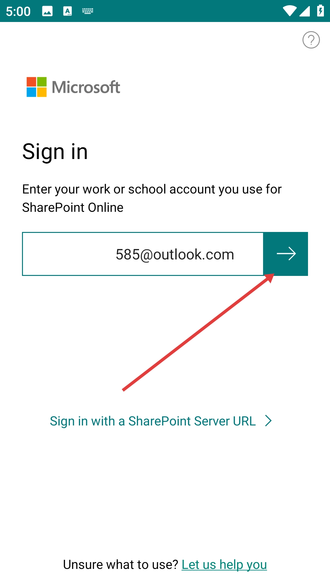 2、输入完成后点击输入框右侧的箭头按钮,继续完成Microsoft账户的登录流程,以便访问SharePointOnline相关服务。