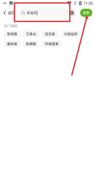 2、在搜索框中输入“杀虫剂”,点击右侧绿色【搜索】按钮,获取杀虫剂相关商品列表。