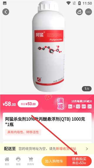 4、在产品详情页,点击【领券购买】按钮,参与满减活动并完成该杀虫剂的购买流程。
