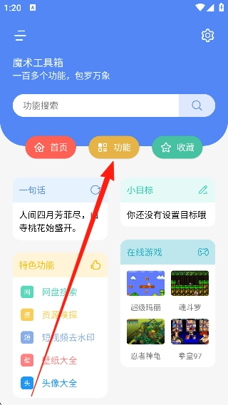 1、打开【魔术工具箱】,点击【功能】按钮,进入功能分类界面查找工具。